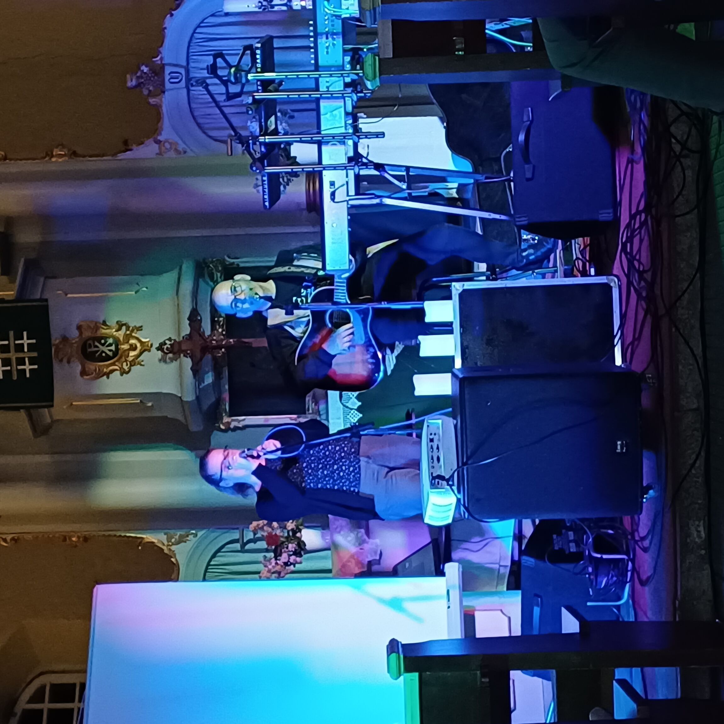 Gerade einmal drei Wochen nach einer Herz-OP erfreute Rösler das Publikum mit einem fast zweistündigen Programm, das einen Querschnitt aus seinem Repertoire bot: ruhigere Stücke lösten sich mit schnelleren ab, die Begleitung wechselte zwischen Akustik-Gitarre und E-Piano/Keyboard und neben der musikalischen Begleitung durch seine Frau Silke, gab es über Projektor/Leinwand auch eine visuelle Unterstützung; so konnten die Zuhörer die Texte verfolgen und waren durchaus auch zum Mitsingen eingeladen! Komplettiert wurde das Ensemble durch Sohn Silas, der für die Sound- & Lichteffekte zuständig war.